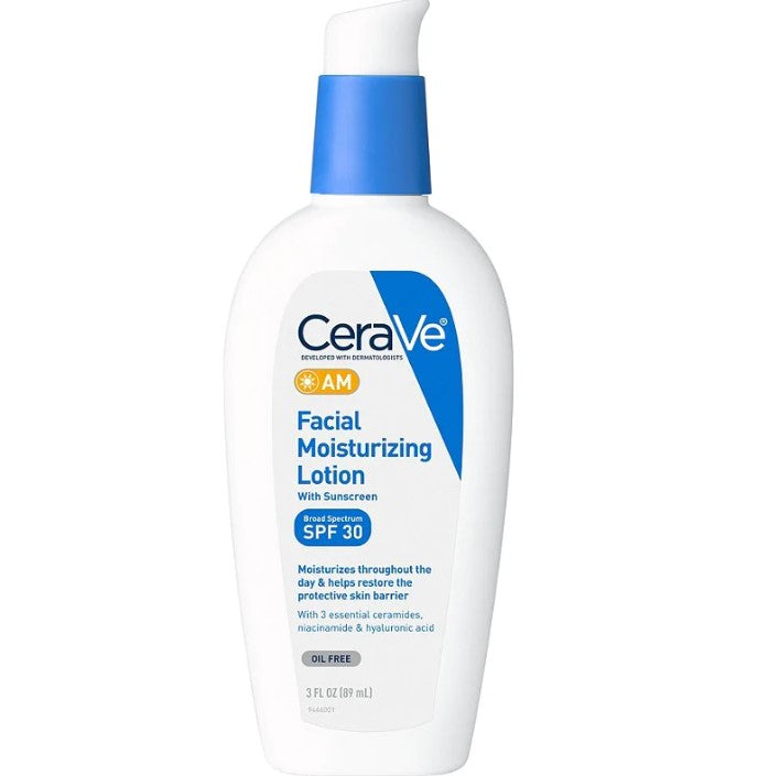 A hydrating face lotion is a key morning skincare step—and a moisturizer with SPF is critical for helping to protect the skin from damaging UV rays. For hydration and skin-barrier replenishment that helps the skin hold on to moisture, look for ingredients like hyaluronic acid, niacinamide and ceramides and a non-comedogenic moisturizer like CeraVe AM Facial Moisturizing Lotion with SPF 30 won’t clog pores or cause acne flare-ups.